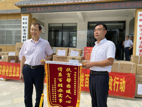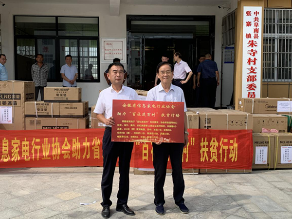 在全面脱贫攻坚这个历史性决战的关键时期,7月10日,安徽省信息家电行业协会助力省民政厅“百社进百村”脱贫攻坚捐赠活动在帮扶村——阜南县朱寺村举行。省民政厅社管局主任唐麟、刘慧,安徽省信息家电行业协会执行会长周保宇、监事会副主席汪华、办公室副主任郭宝,协会创始会长、原省经济和信息化委员会党组成员、局长夏传友,长虹美菱、尊贵电器等会员企业代表,以及阜南县民政局李旭东、唐成龙,阜南县张寨镇镇长袁辉、副主席闫振鑫、民政所所长李同宝,朱寺村支部书记张春楠,贫困户代表参加活动。活动由协会汪华同志主持。