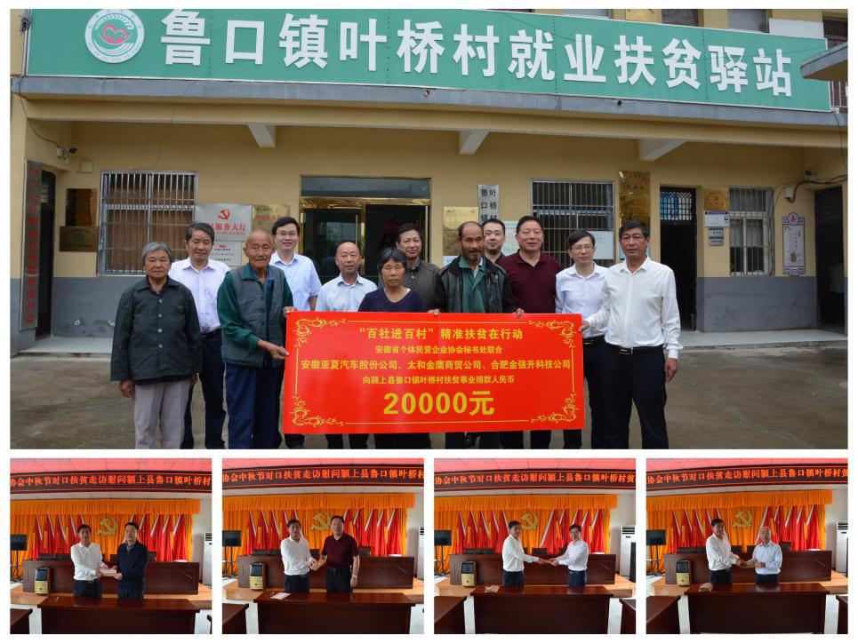 会上,陆杰武秘书长代表省个民协会秘书处,与省个民协会副会长单位、太和县金鹰商贸公司王平义董事长和亚夏汽车股份有限公司周晖总经理,省个民协会理事单位、合肥金强升科技发展有限公司葛敬高总经理联合向叶桥村扶贫事业捐款共计2万元。